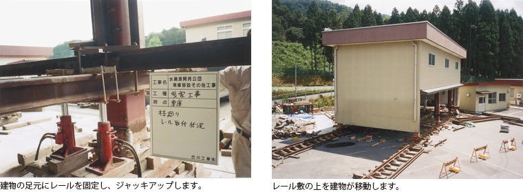建物を解体せず、既存建物の下にレールを入れて持ち上げ移動する工事で、現在ある位置より移動・回転・上げ・下げをします。